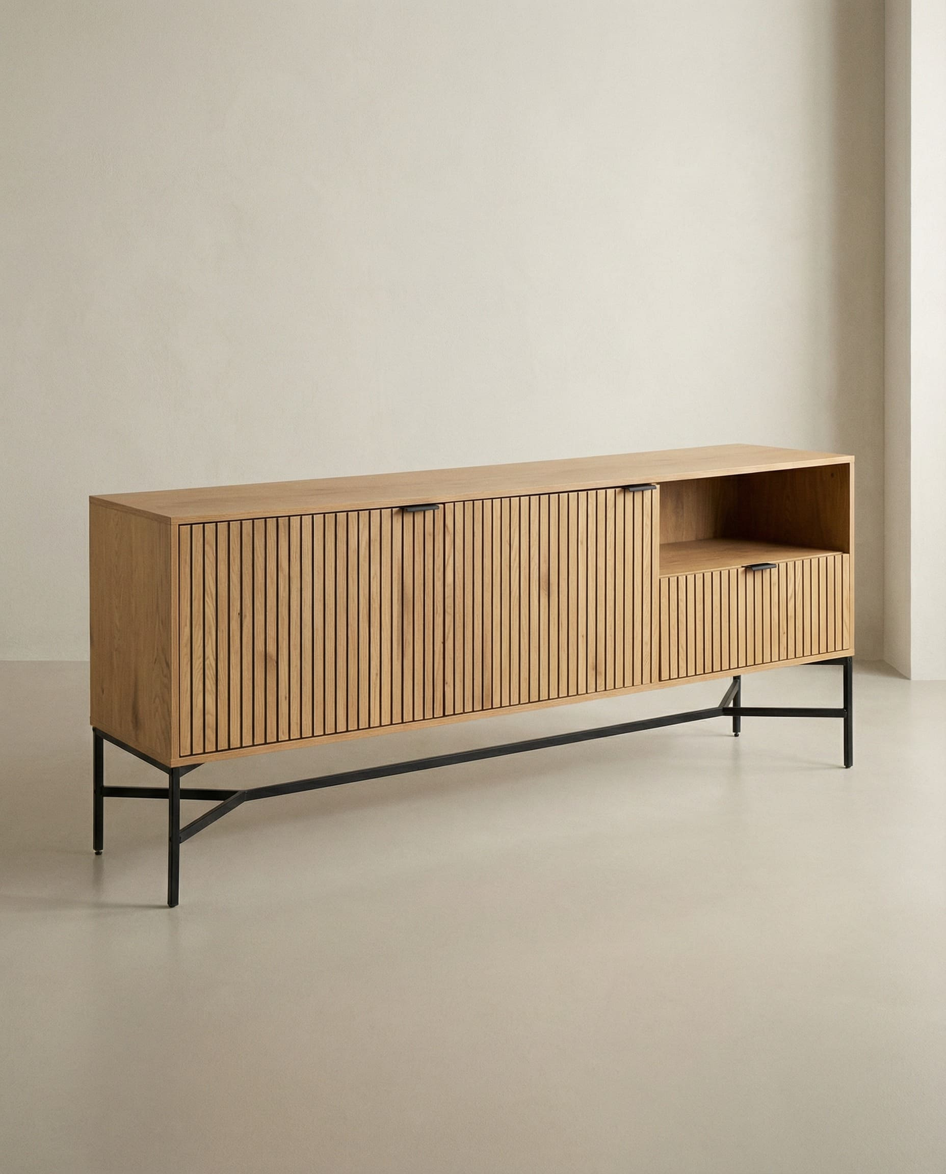 El aparador DUREL es una declaración de estilo para cualquier espacio. Su diseño minimalista con acabado en roble y frentes de listones de acero negro aporta un toque moderno y atrevido. Con compartimentos cerrados y abiertos, permite almacenar y organizar de forma práctica y elegante.