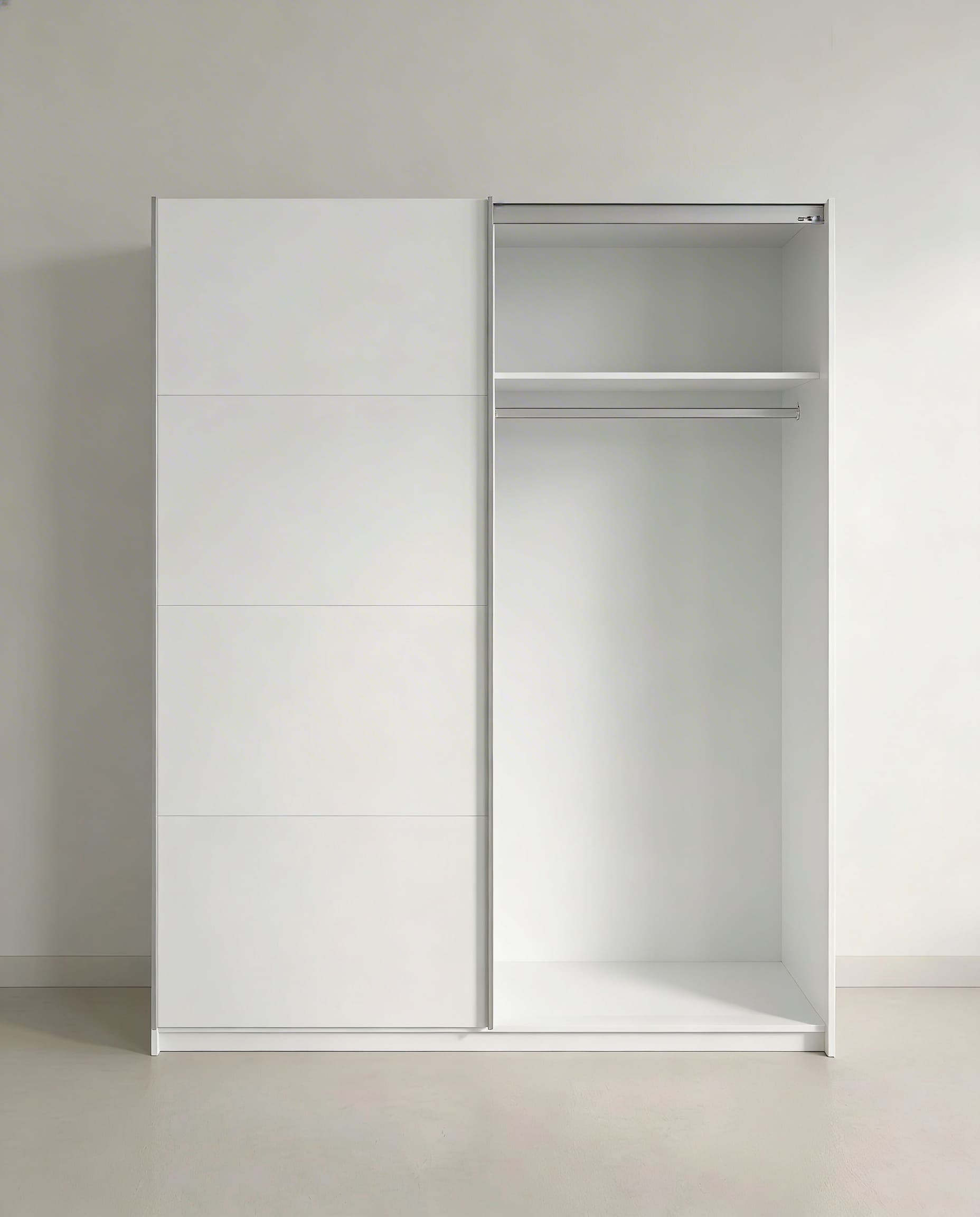 El armario 2 puertas correderas ATENAS, es un armario que encaja perfectamente en cualquier dormitorio, en color blanco y tiradores de aluminio (perfiles).