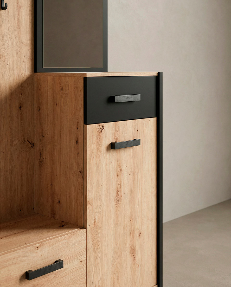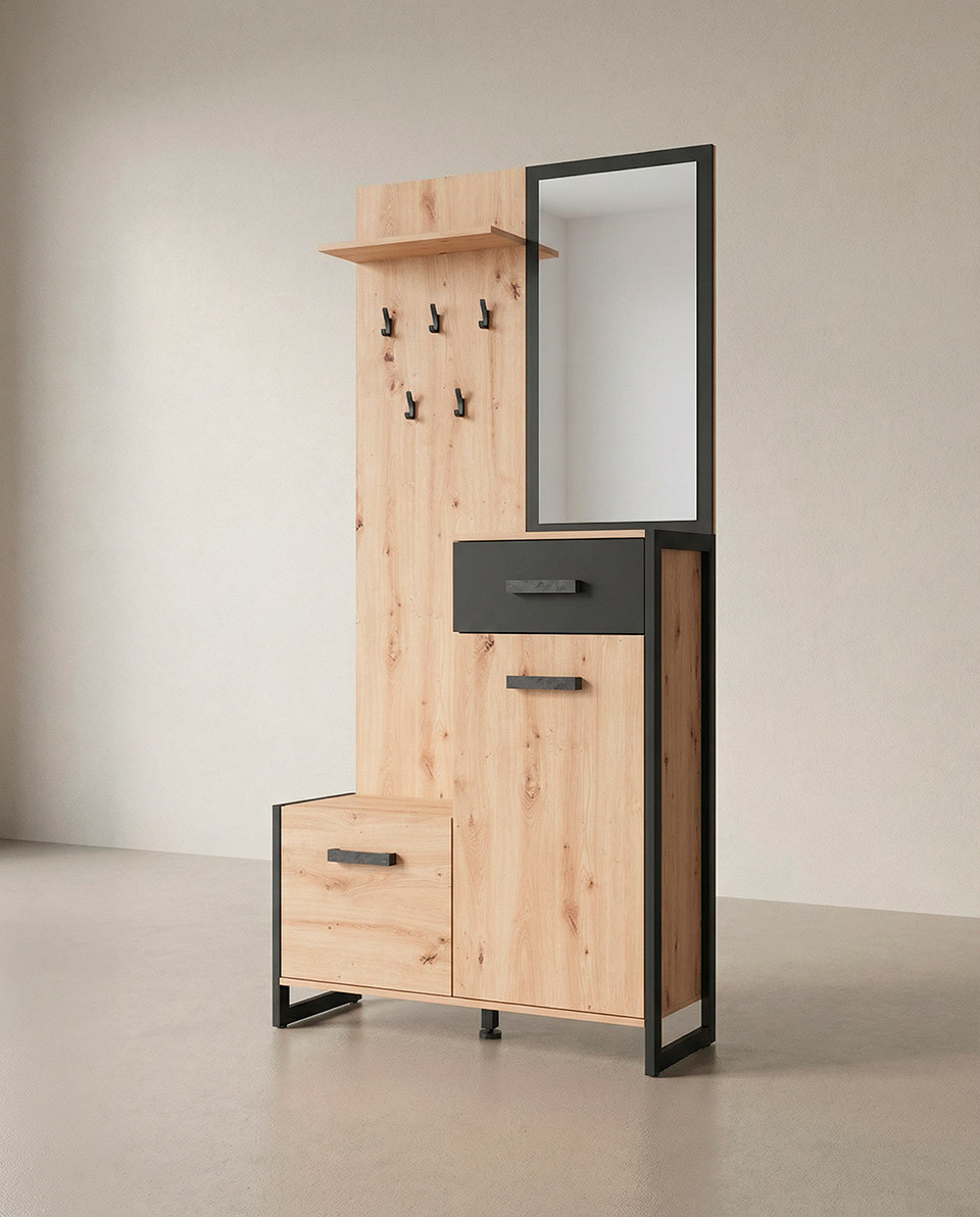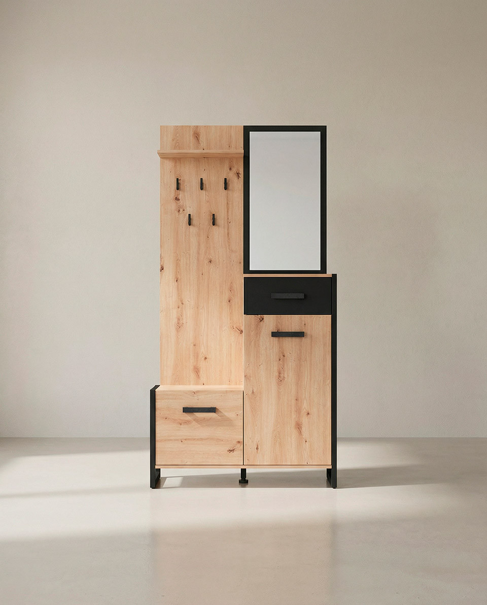 Práctica recibidor con dos puertas, cajón y cinco colgadores. Además cuenta con estante superior. Con espejo laminado y color roble artisan y negro es perfecto y útil para cualquier recibidor con una gran capacidad.