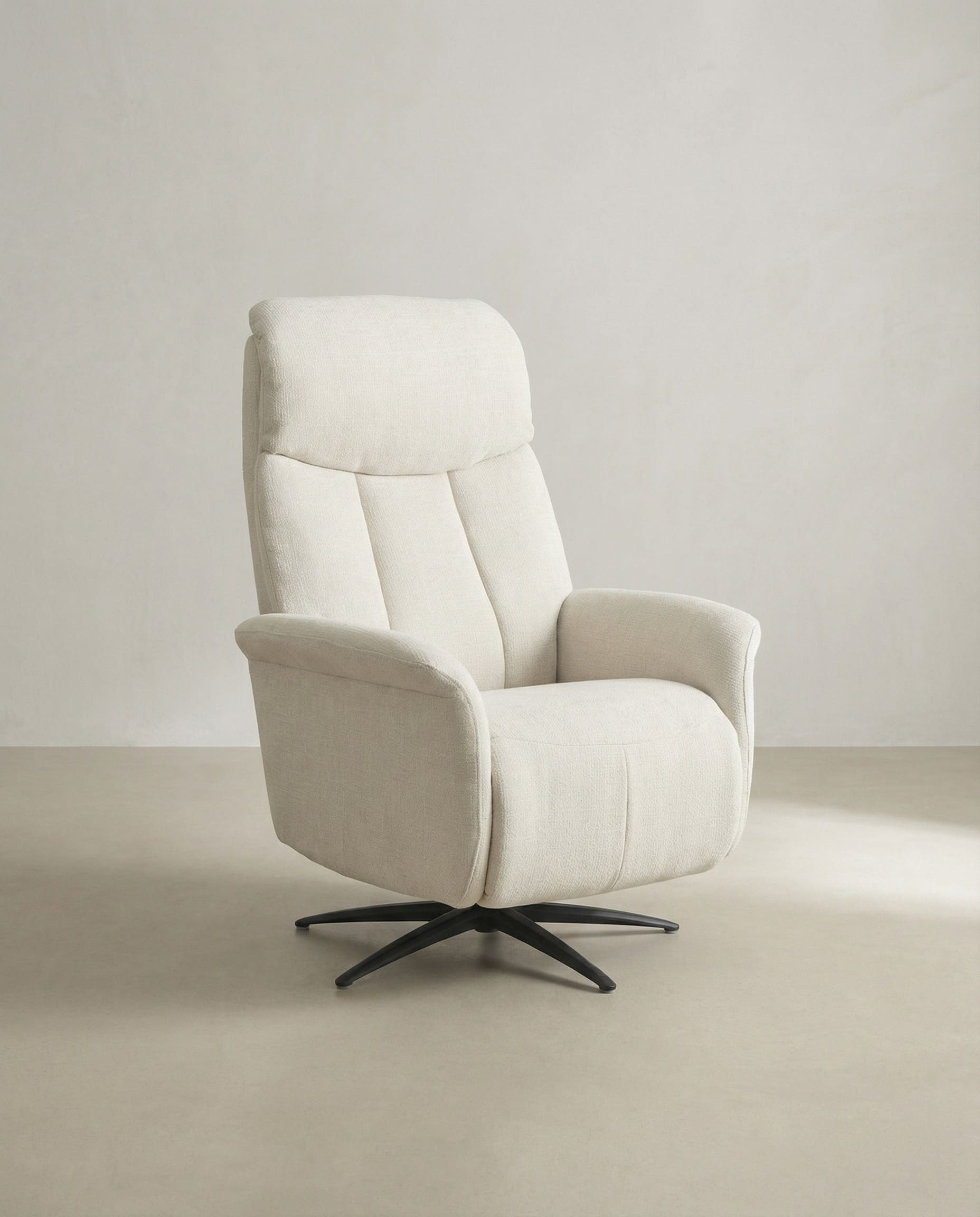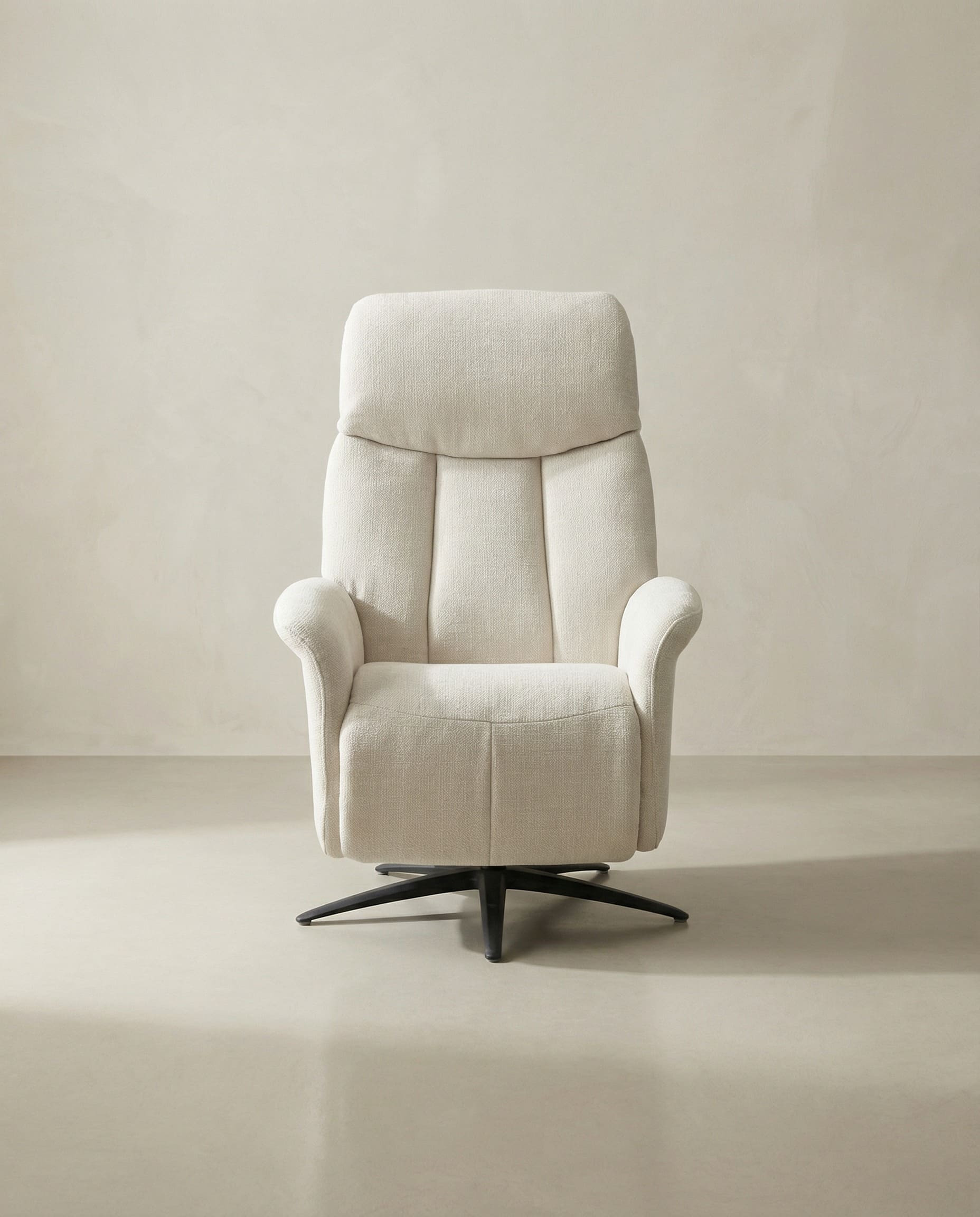 Sillón relax giratorio y eléctrico. Tapizado en tela color beige.