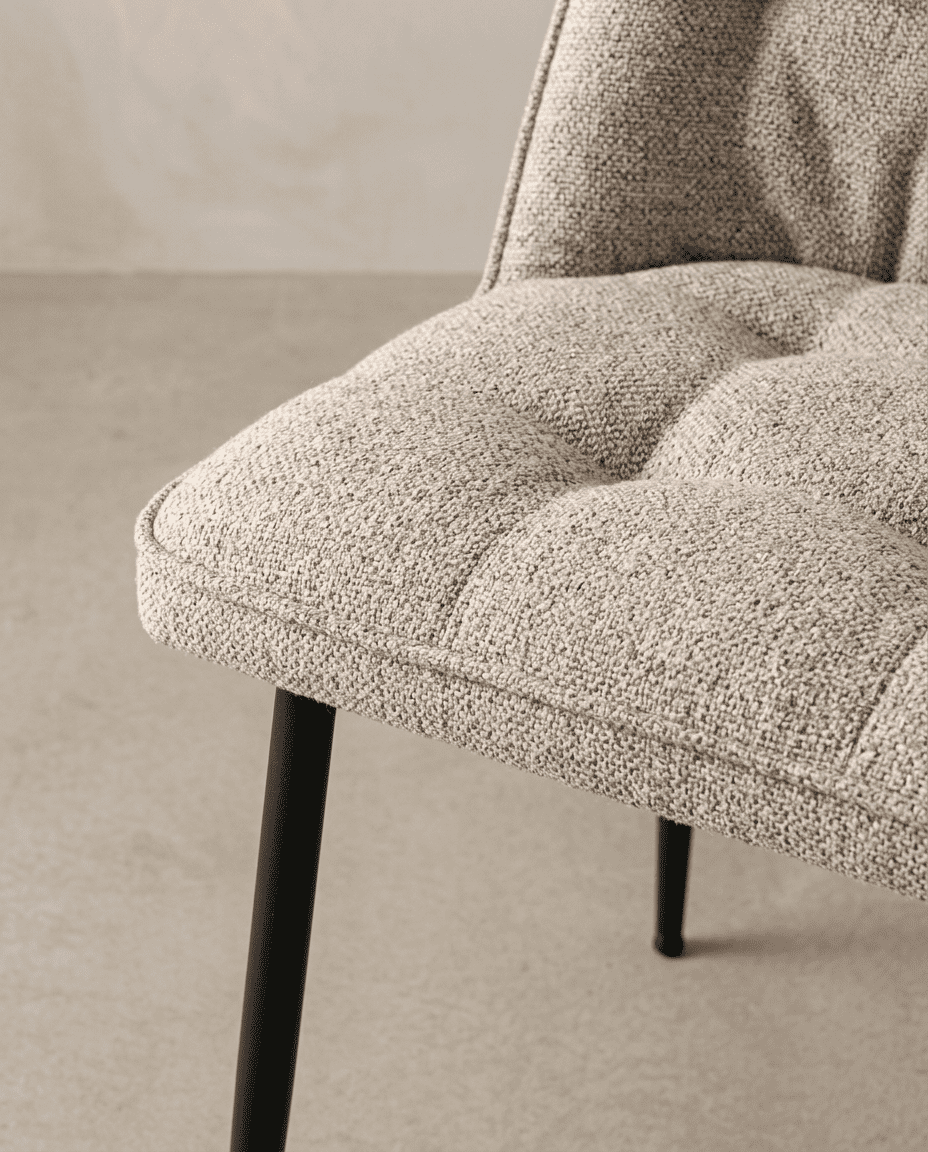 Tapizado en tela beige y patas metálicas negras estilizadas.