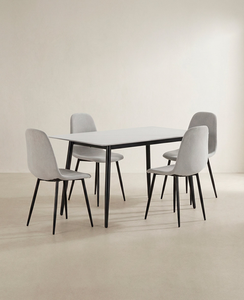 Conjunto de mesa tapa cerámica y cuatro sillas, las sillas pueden ser tapizadas en blanco o gris.