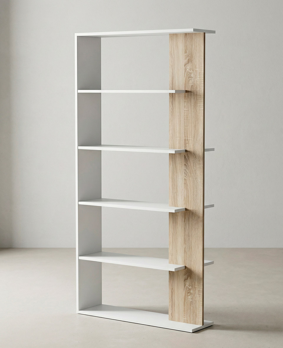 Estantería separadora de ambientes con cuatro baldas, en combinación de colores blanco artik y roble canadian.