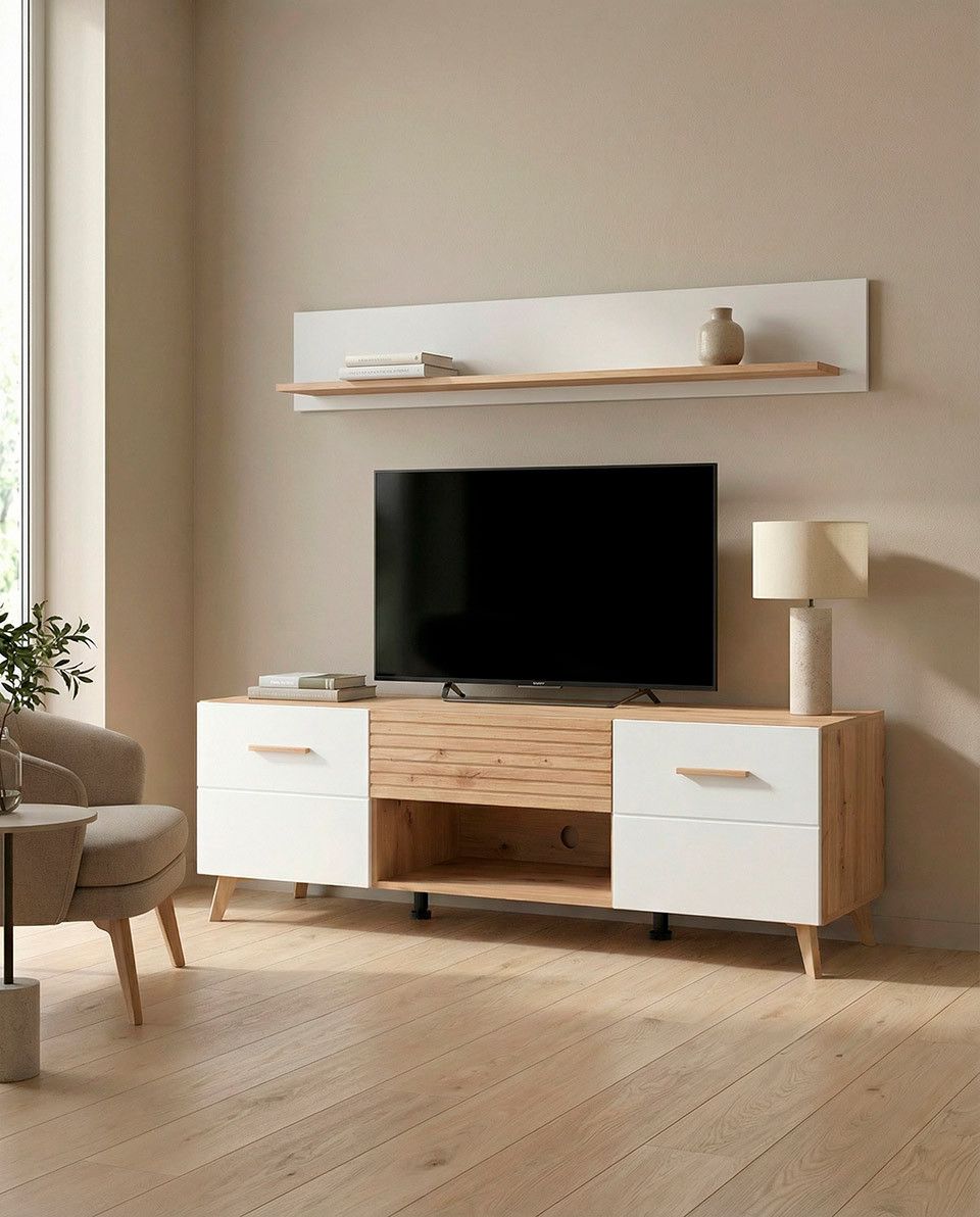 Con el estante de pared ELAN conseguirás aprovechar al máximo el espacio sobre la zona de televisión o para decorar cualquier pared de tu casa. Puedes combinarlo con el resto de muebles de la misma colección.
