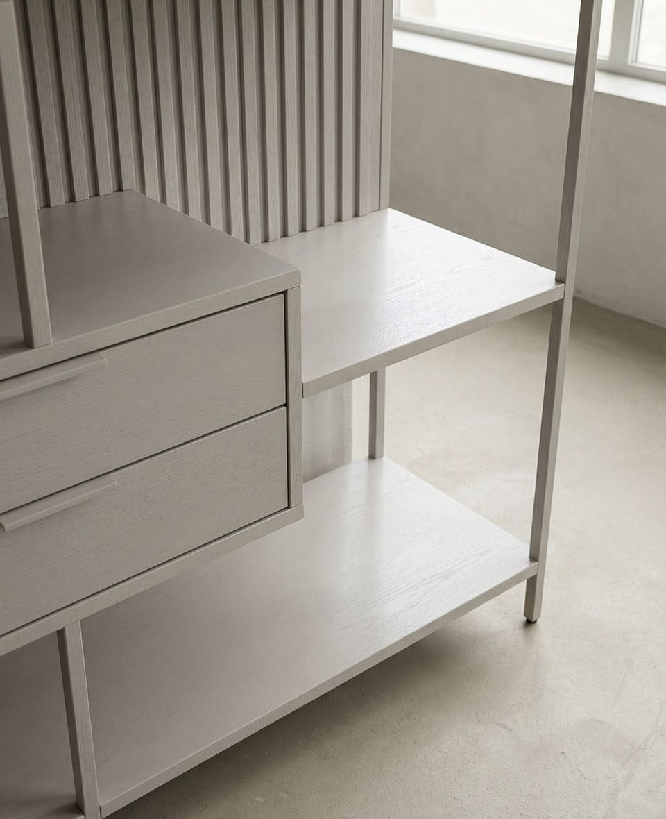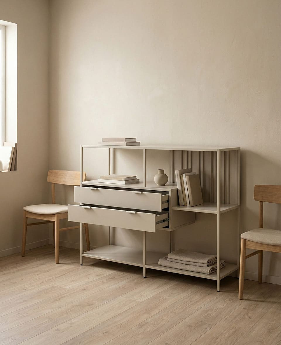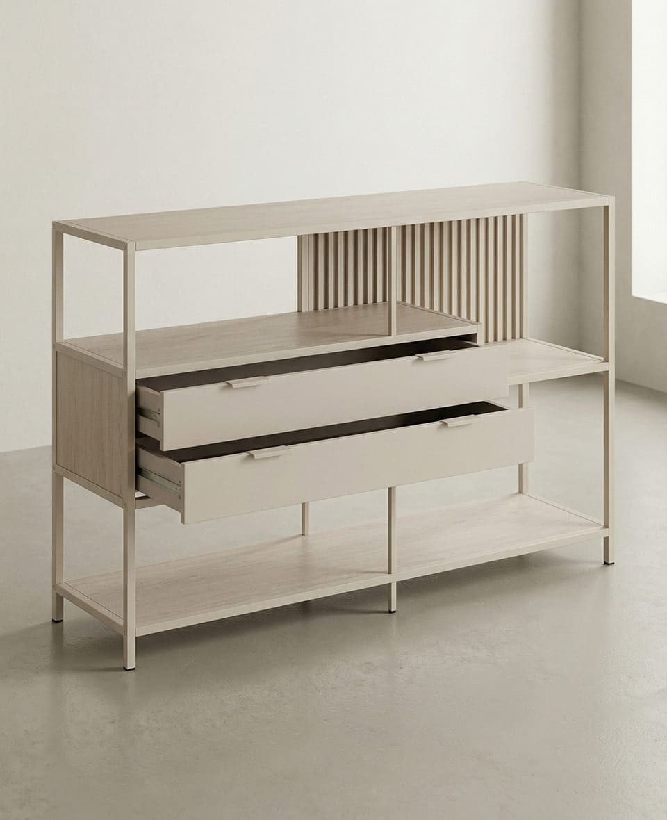 Está formada por una estructura metálica con estantes y cajones en melamina.