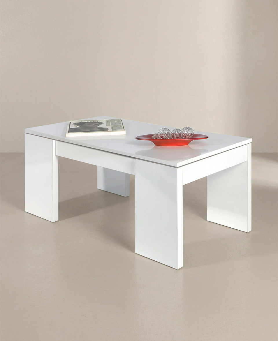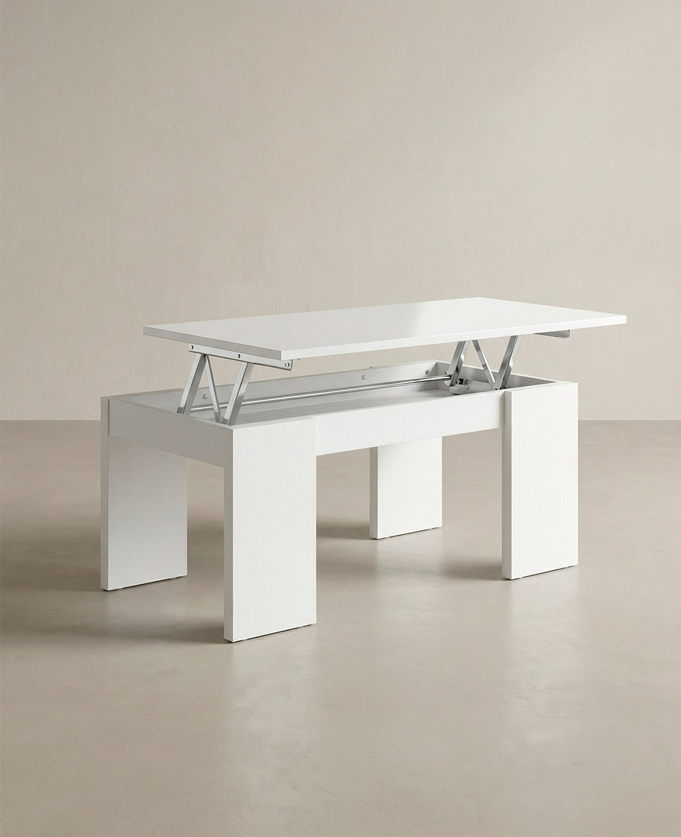 Mesa de centro elevable con hueco revistero, disponible para elegir en color Blanco o Roble.