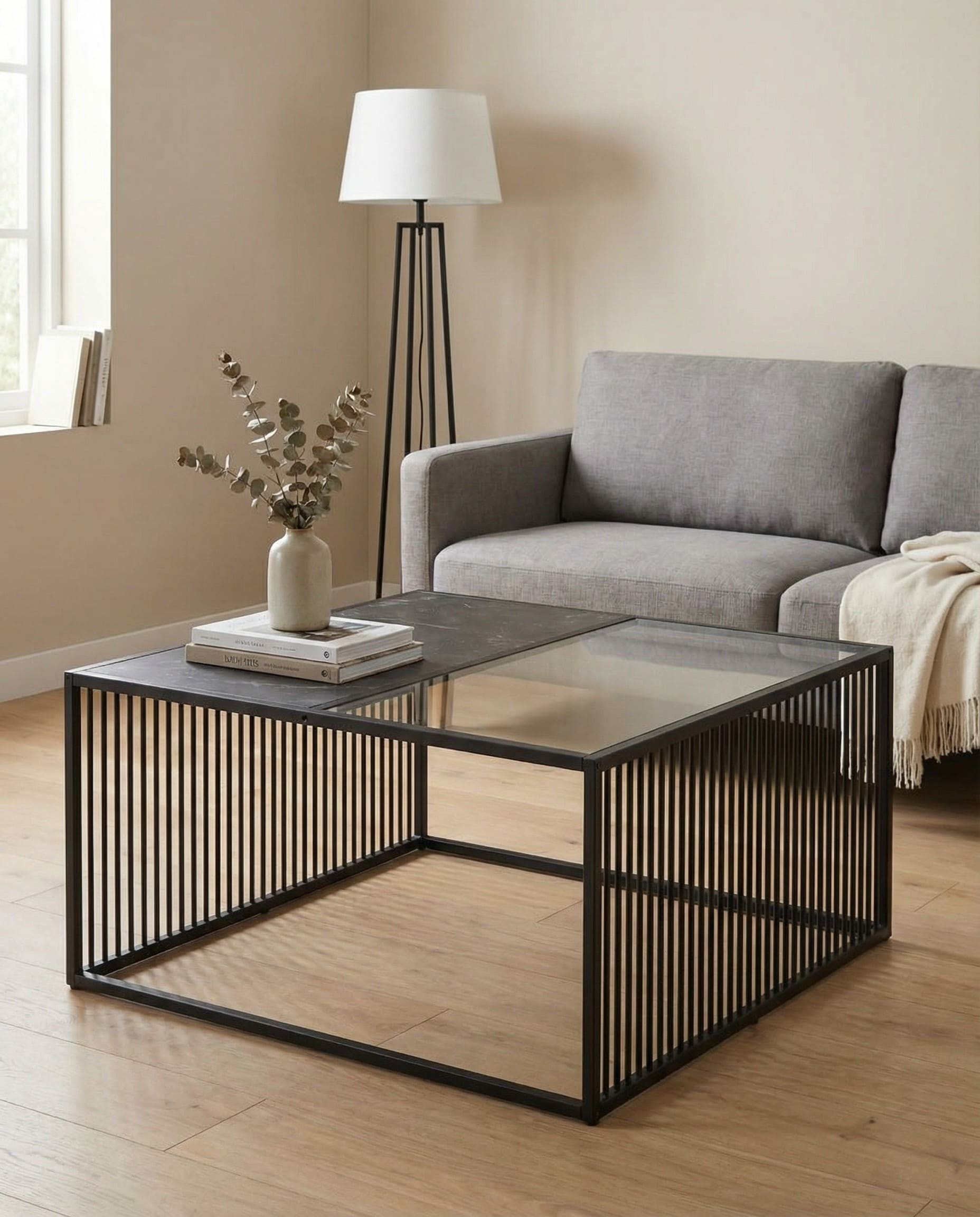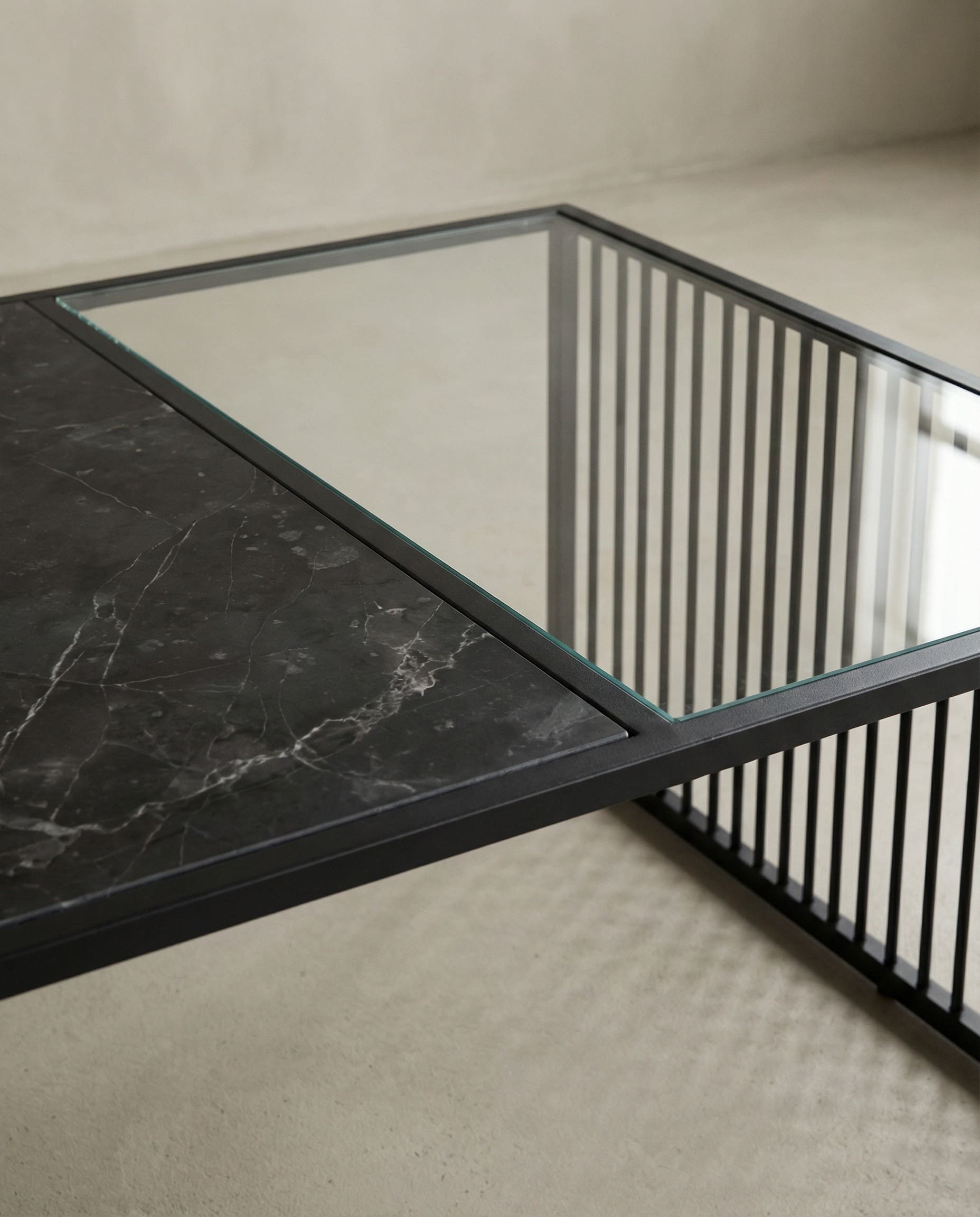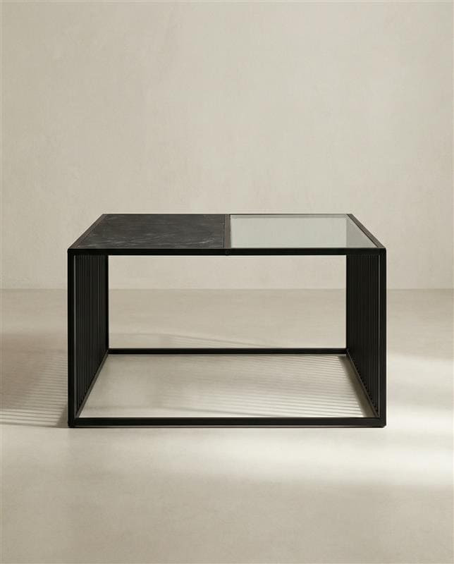 Mesa centro cuadrada metálica negra, tapa combinada simil mármol y vidrio ahumado.