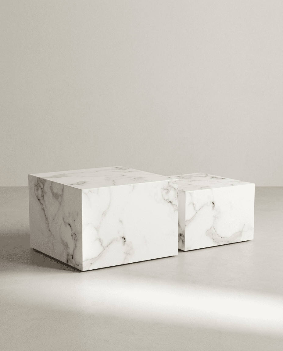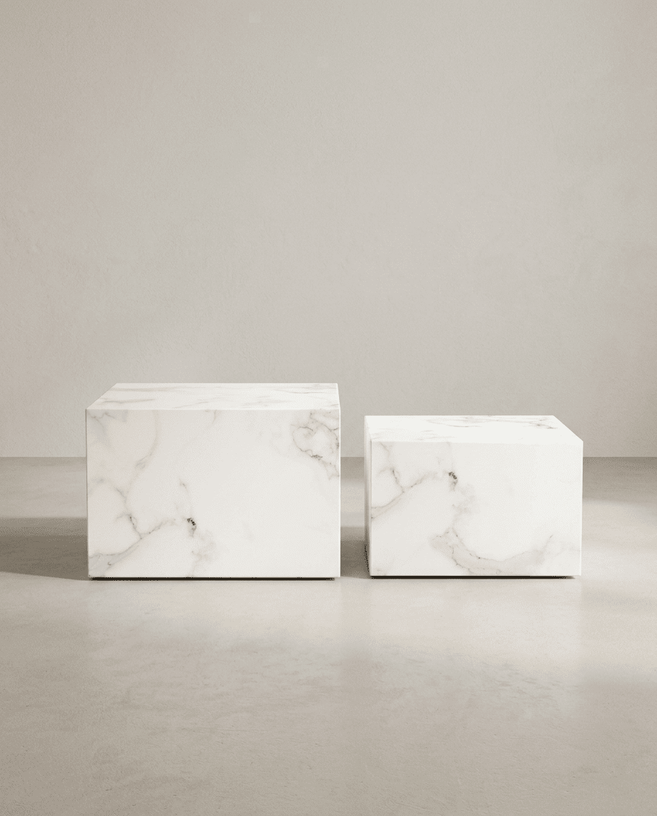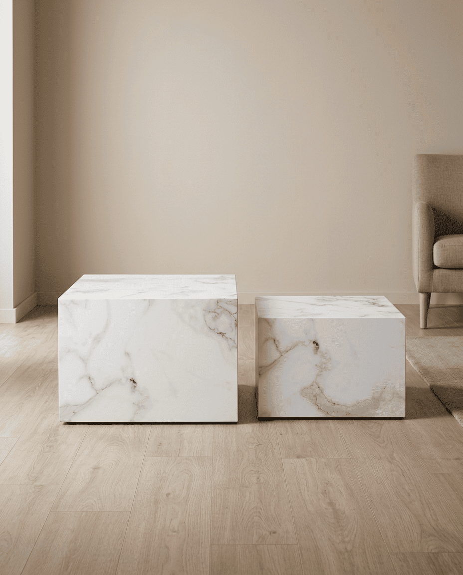 Juego de 2 mesas de centro cuadradas independientes con la base de MDF laminado imitando al mármol.