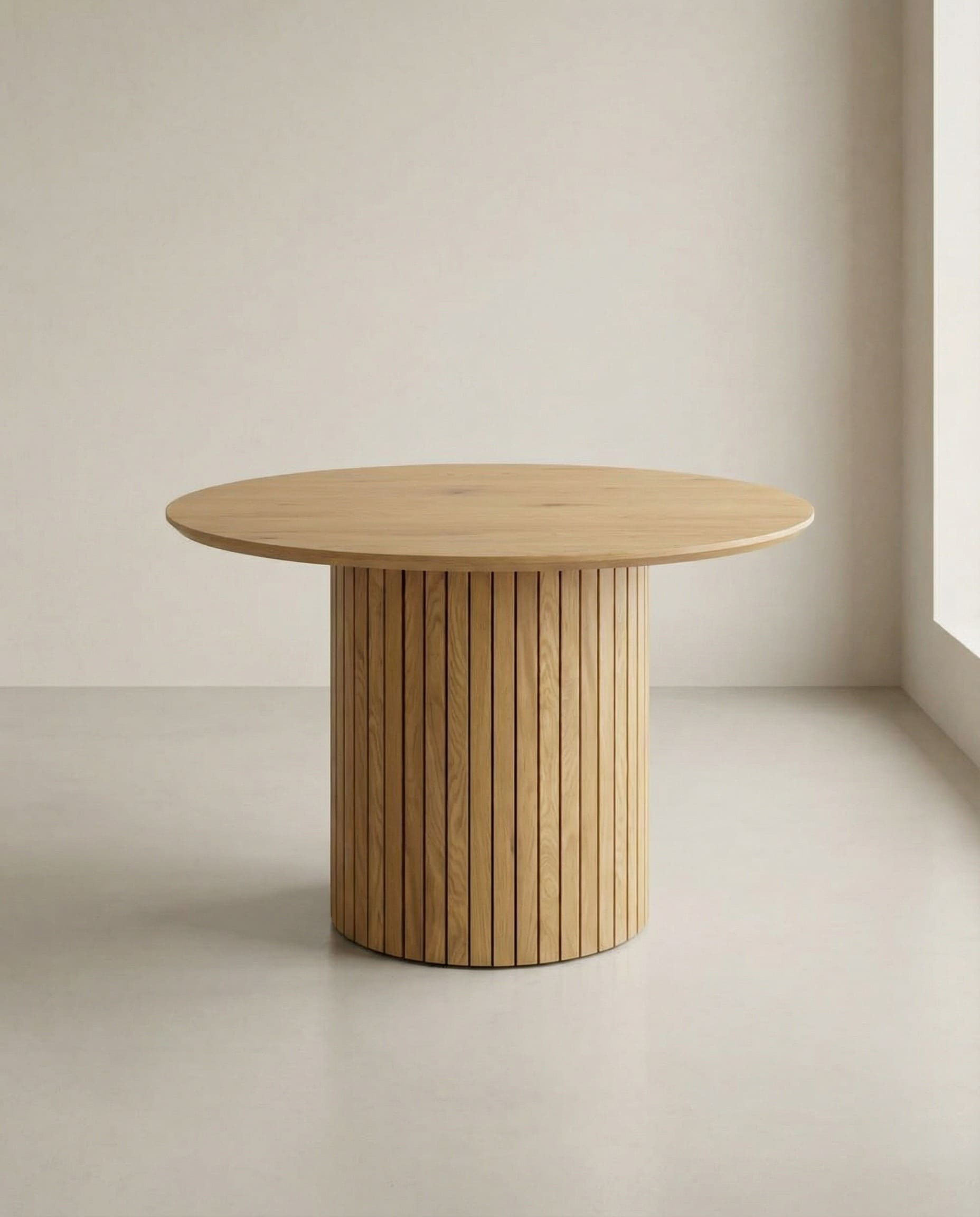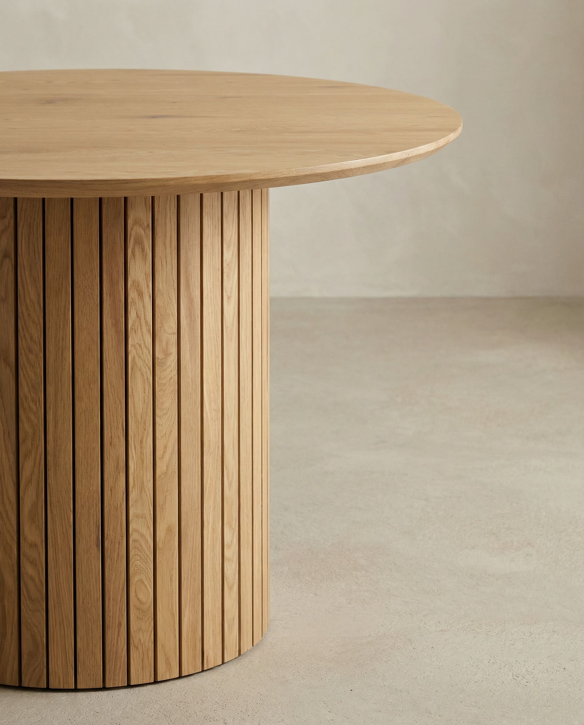 La mesa de comedor redonda ZELAR combina estilo escandinavo y funcionalidad para crear un espacio acogedor y natural. Perfecta para salones, permite reunir a amigos o familia alrededor de su tablero de roble silvestre, disfrutando de comidas, snacks o sobremesas en un ambiente cálido y agradable.