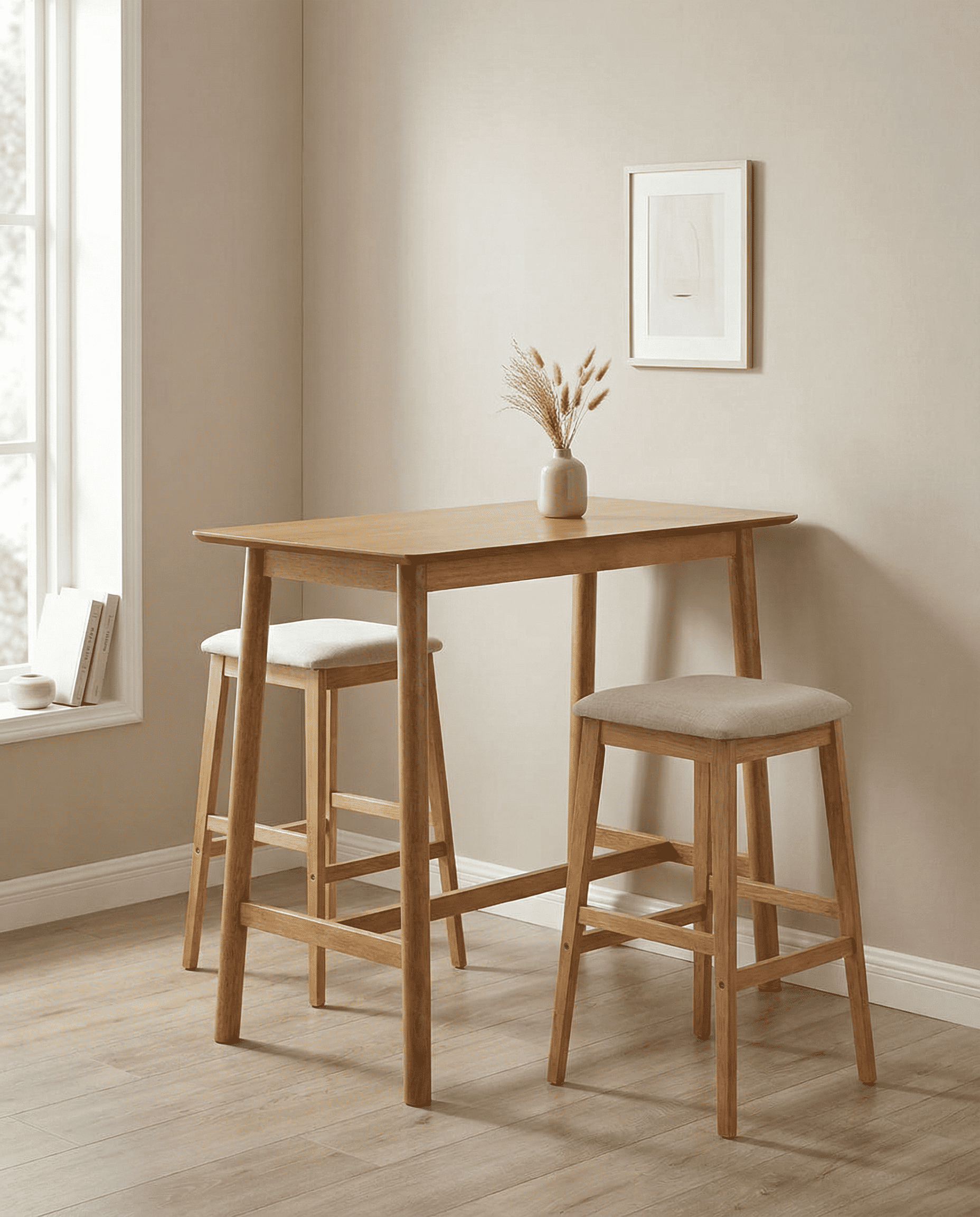 Destaca por su diseño compacto y versátil, ideal para espacios reducidos o cocinas abiertas. Su estética de inspiración nórdica permite combinarla fácilmente con taburetes de madera o metal para crear un ambiente moderno y acogedor.