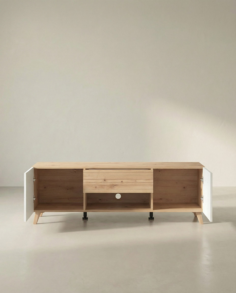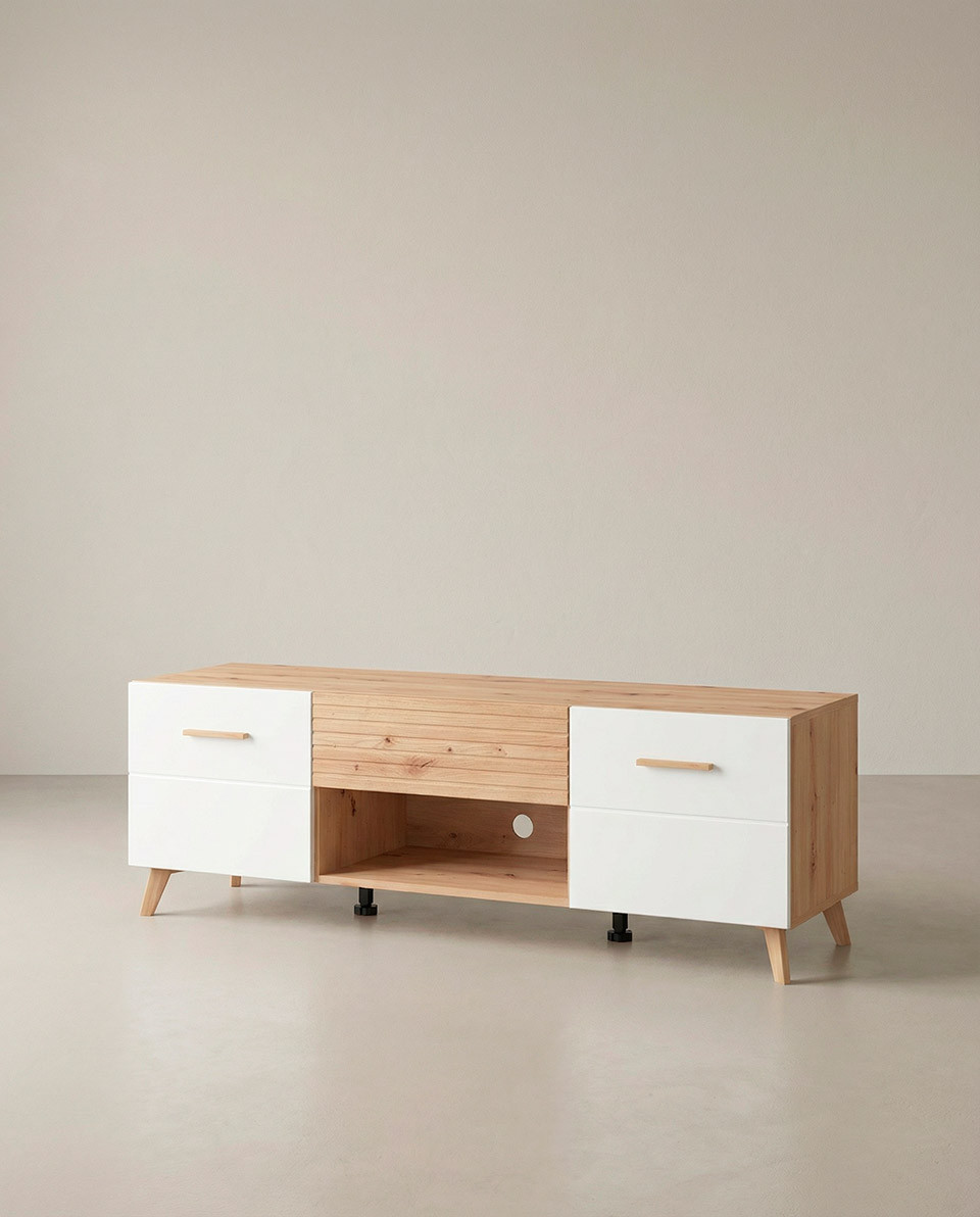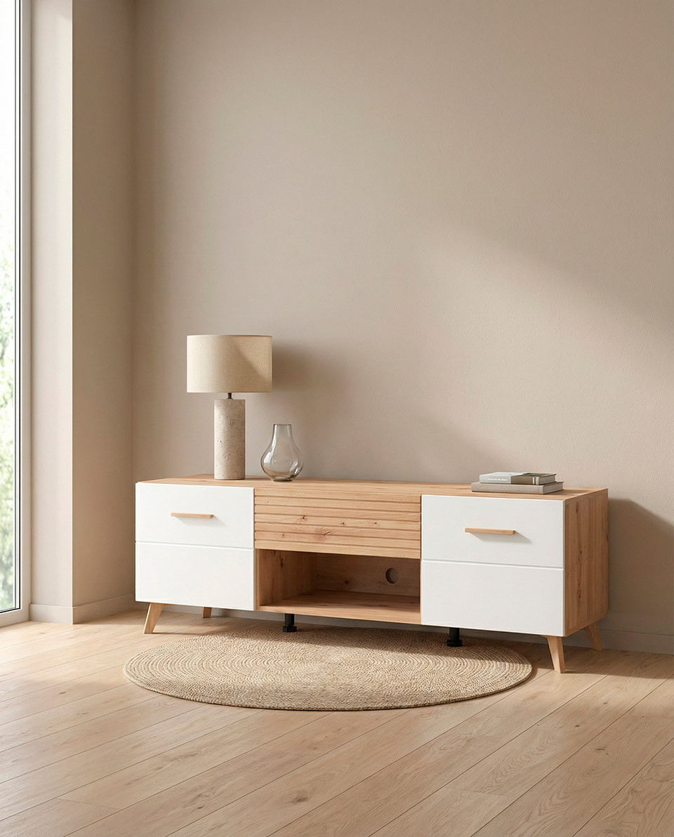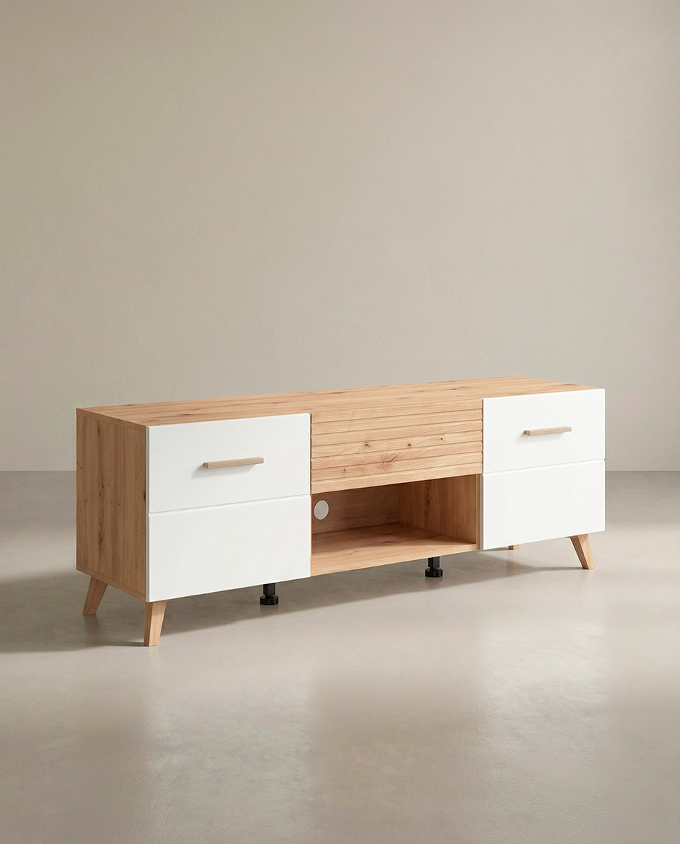 Mueble para tv con 2 puertas 1 cajón y 1 hueco, laminado en color roble natural combinado con blanco.