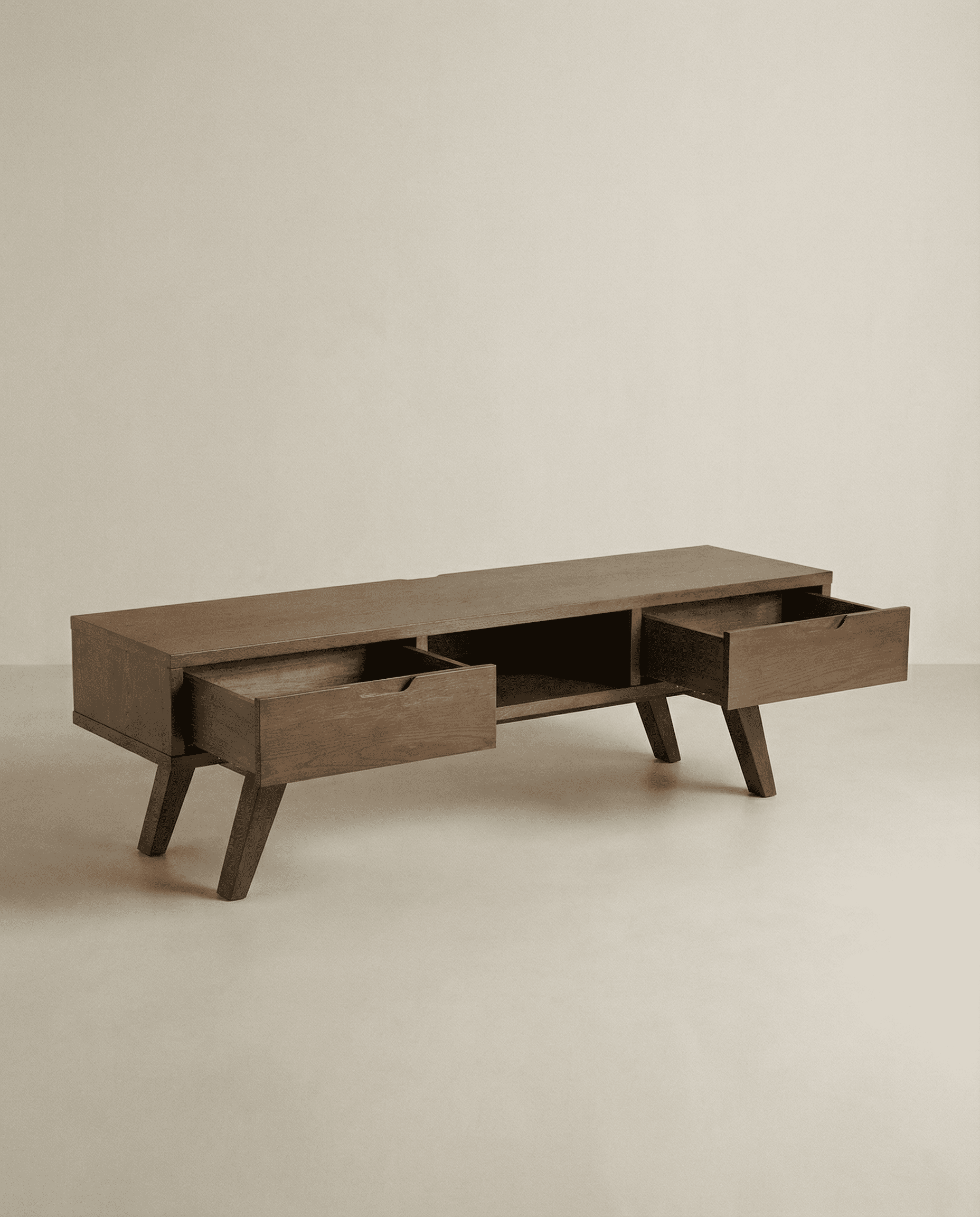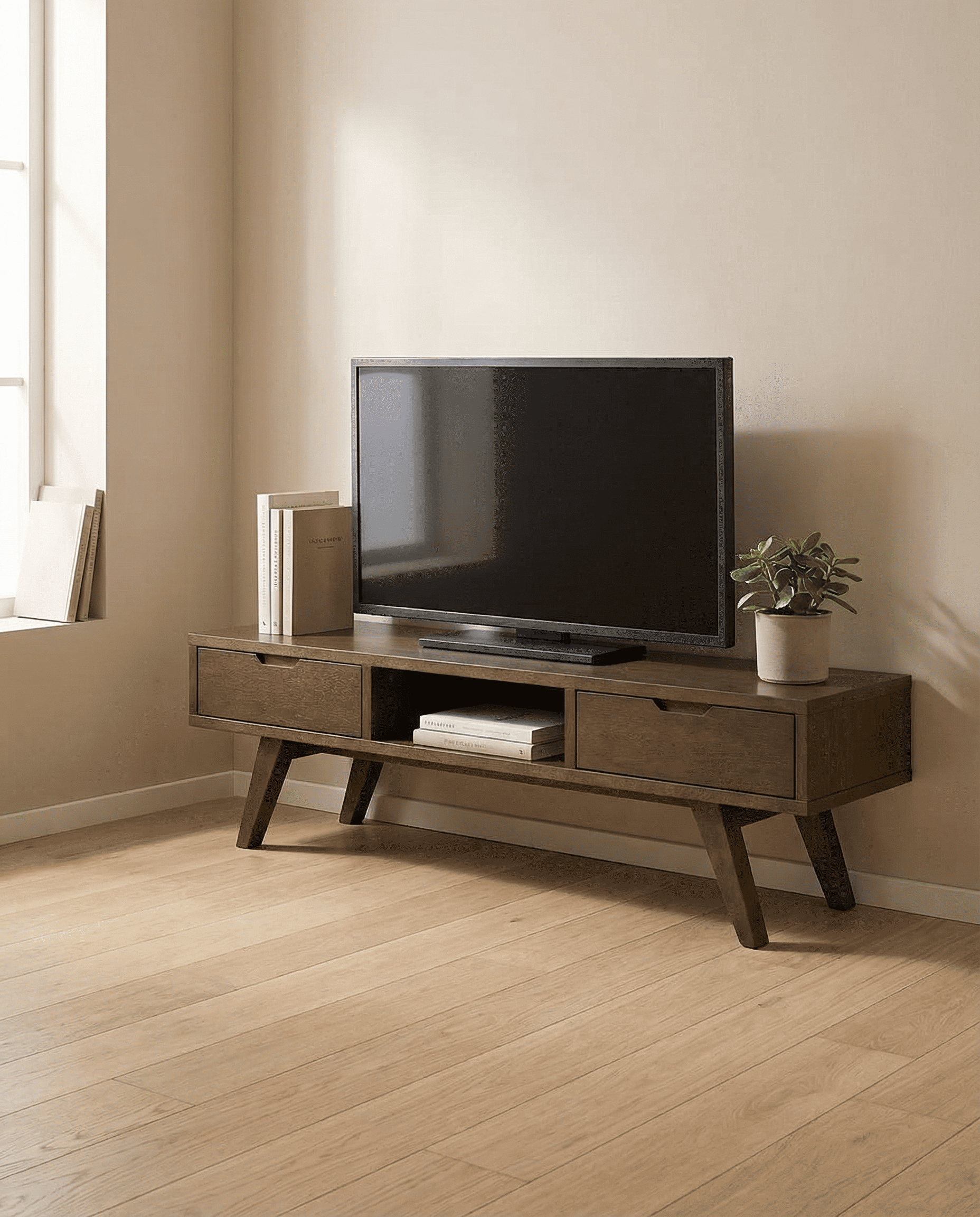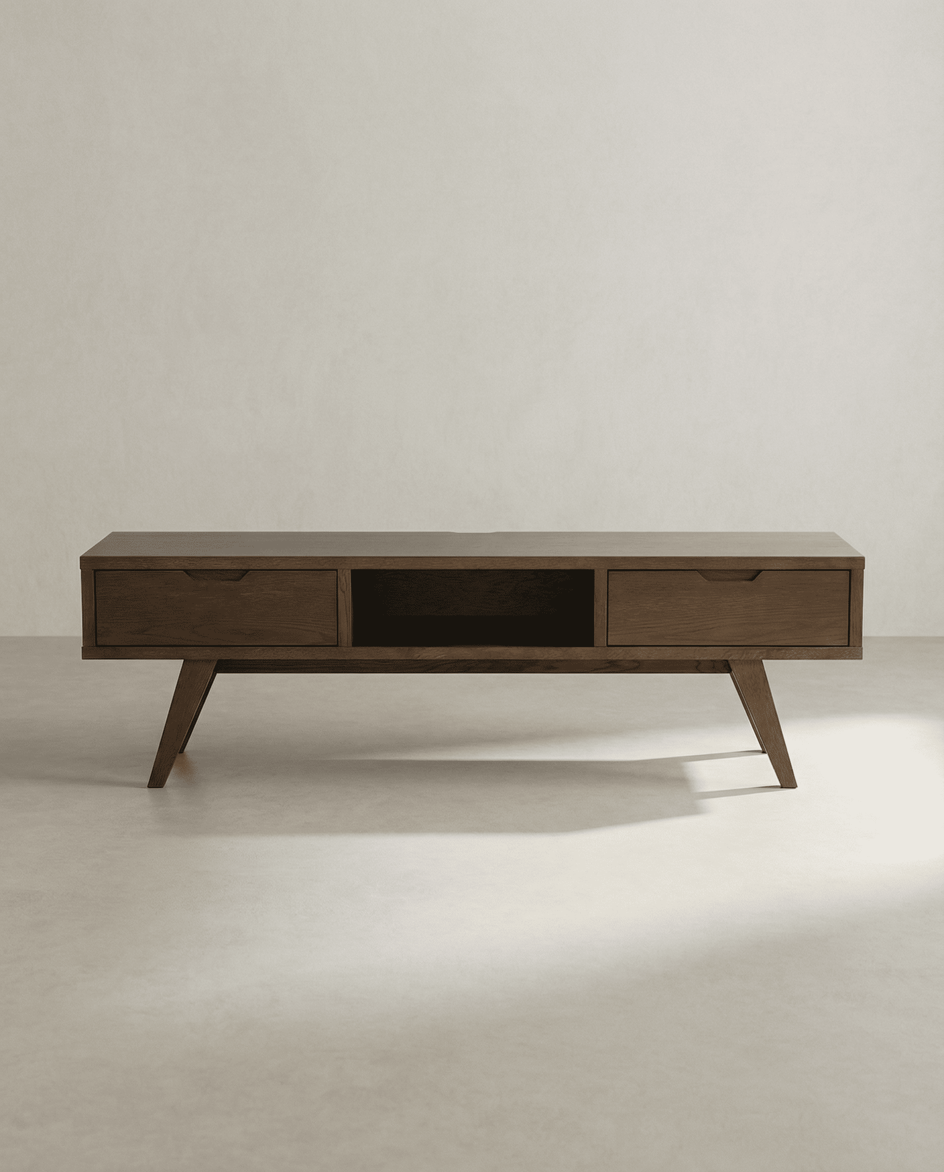 Mesa TV roble KELON, es una versión moderna del diseño escandinavo clásico, su perfil ofrece una imagen elegante y contemporánea.