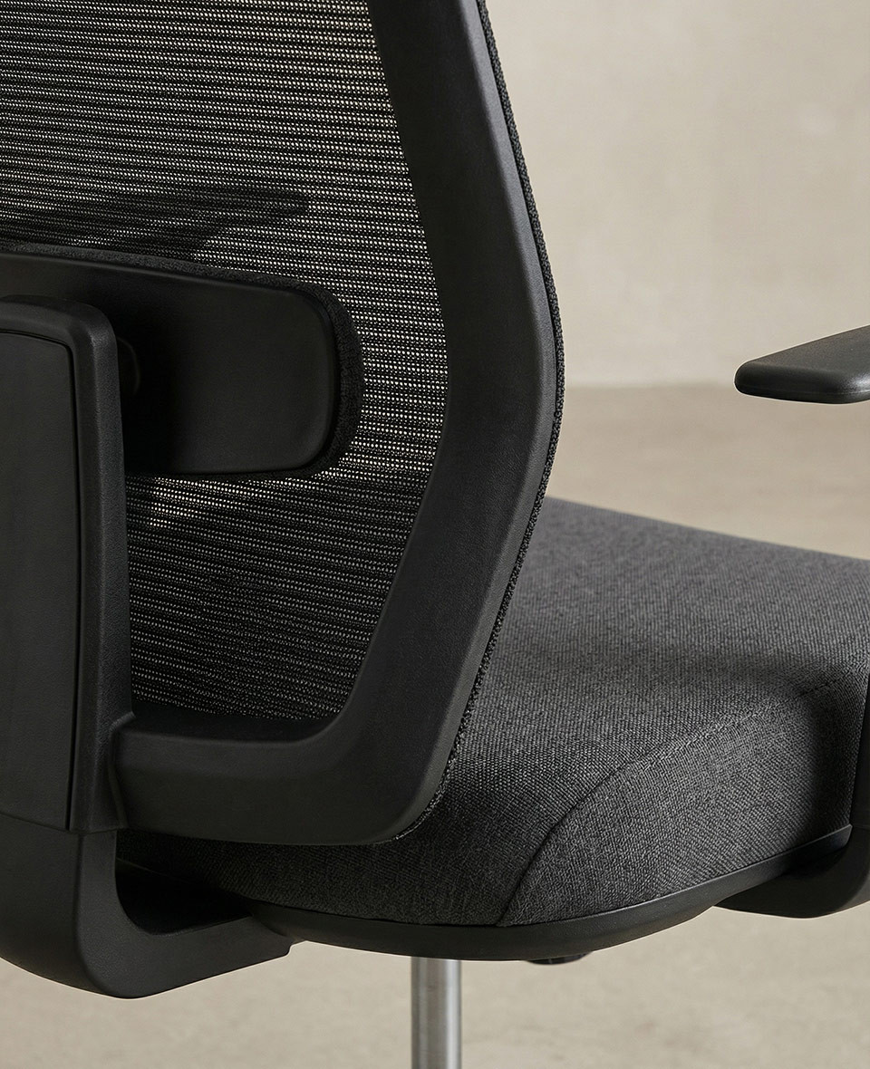 El respaldo de la silla es una malla con soporte lumbar ajustable. Los reposa-brazos son de nailon. Consta de un mecanismo mariposaY-17.