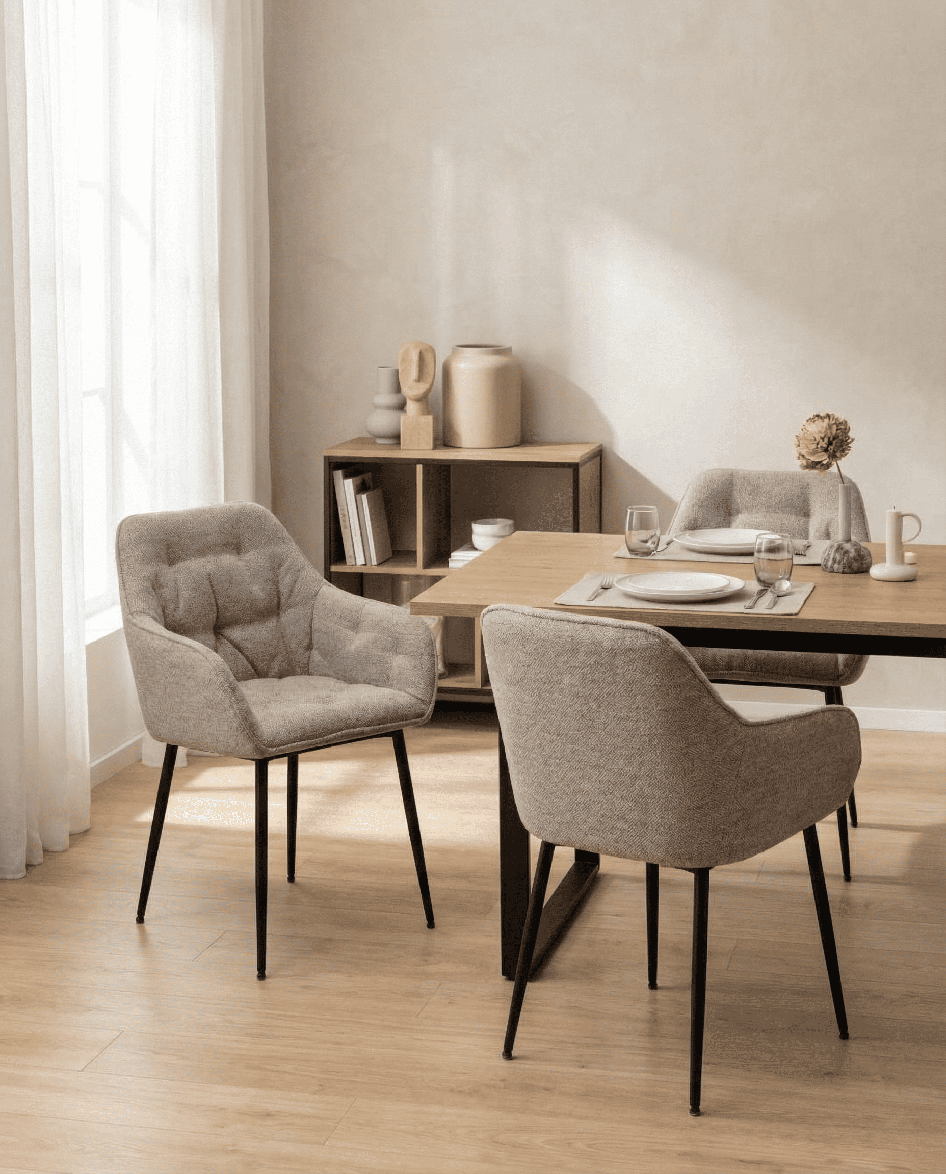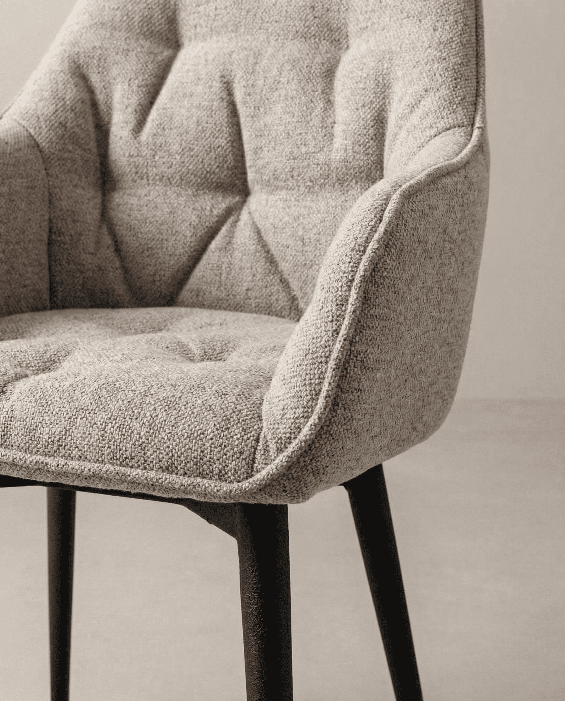 Pack de 2 sillas de comedor con reposabrazos, acabado capitoné, tapizado en color beige o gris , patas de metal rugoso negro mate.