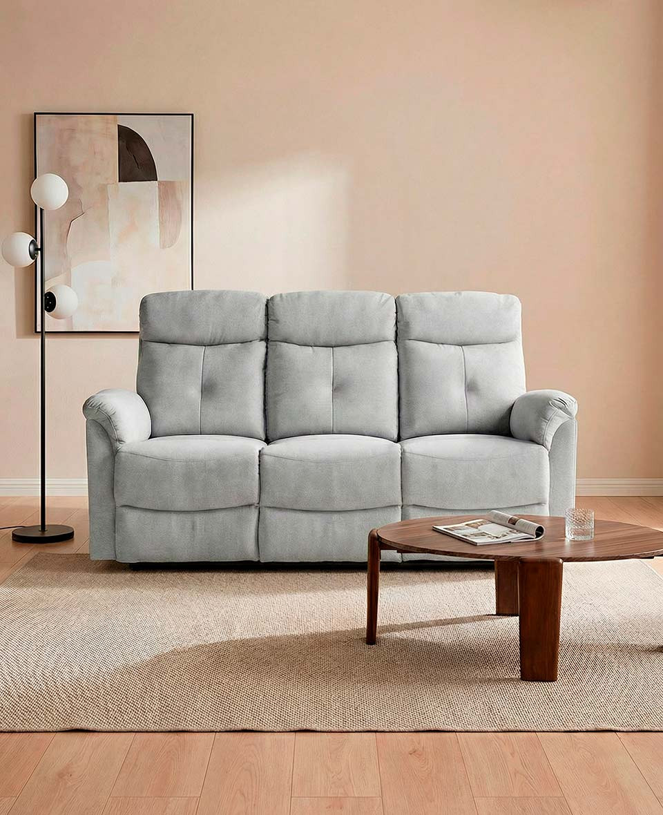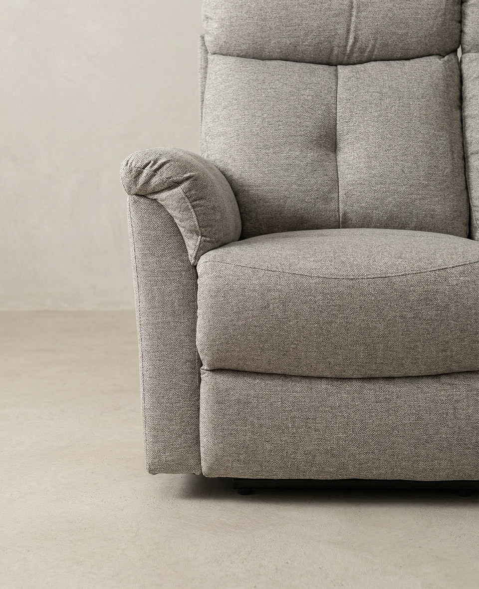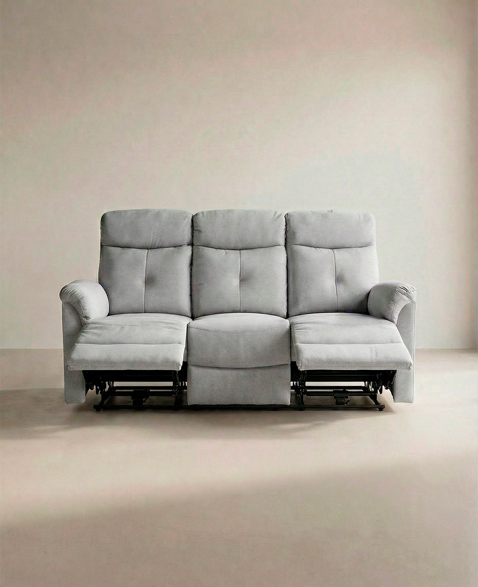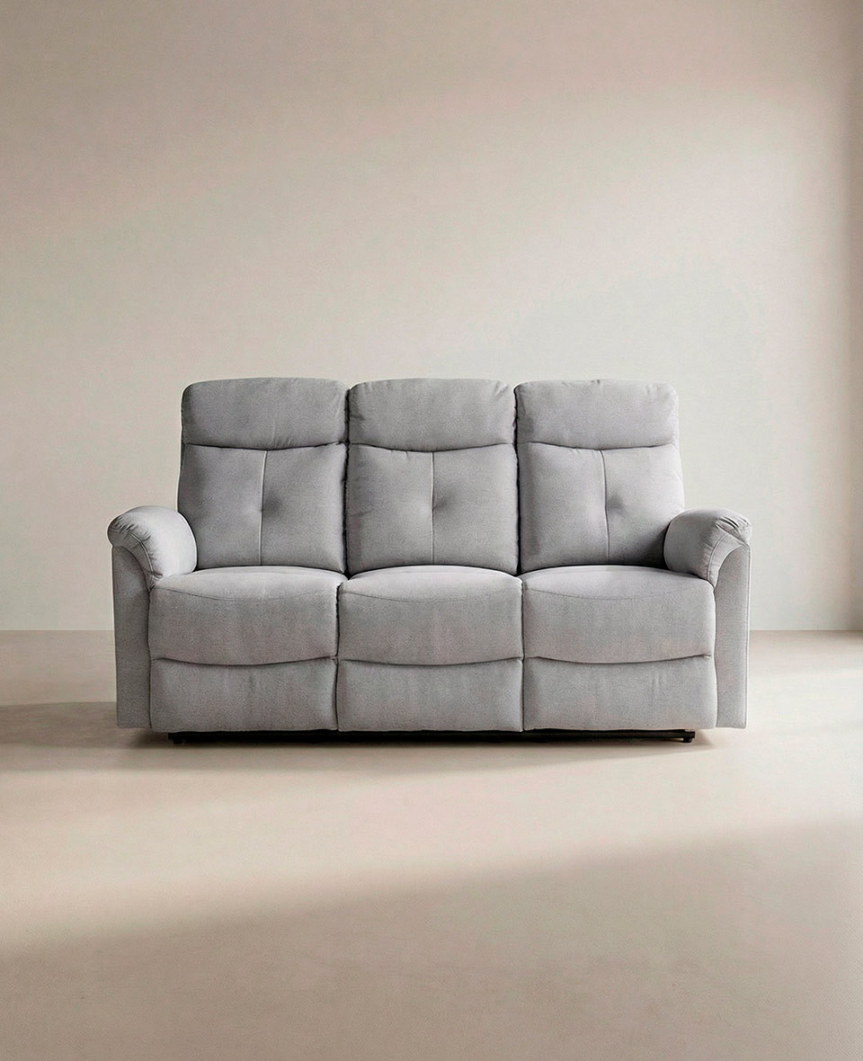 Sofá de 3 plazas con 3 asientos relax con palanca manual. Tapizado en color gris . Medidas: 188 x 95 x 100 cm. alto.